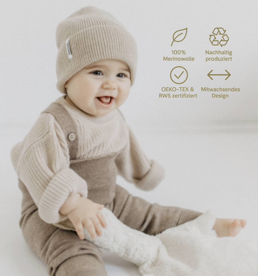 Unsere weiche Babymütze aus 100% feinster Bio-Merinowolle ist das perfekte Accessoire für unsere Kleinsten. Sie wächst mit deinem Kind mit und sorgt stets für optimalen Komfort.